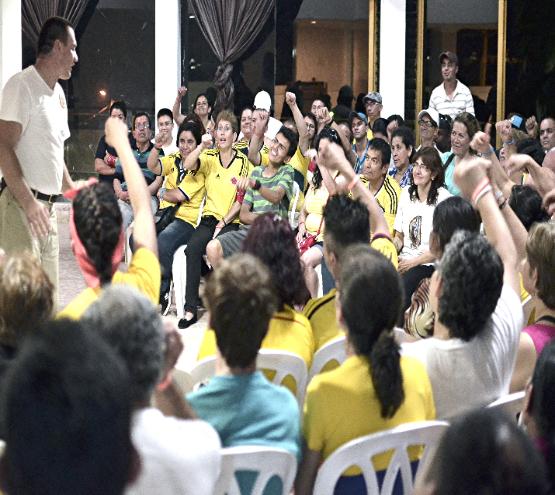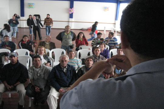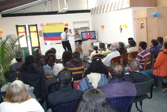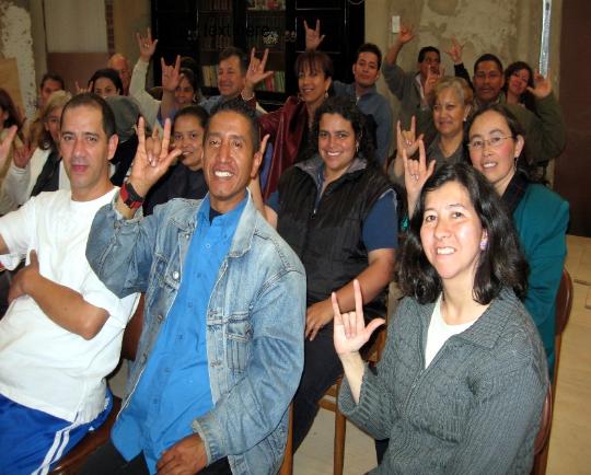 A television lecture being interpreted to the deaf people during a DMI Conference in Colombia South America